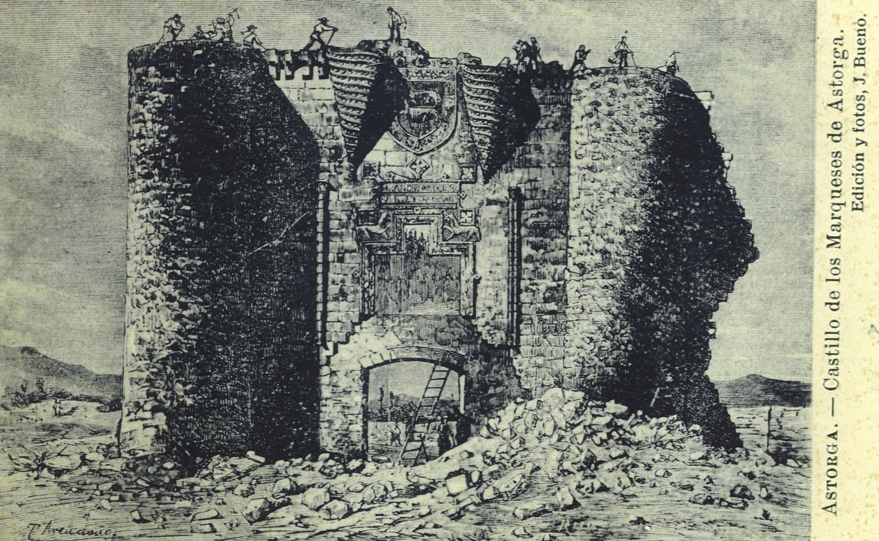 … con anterioridad a la fecha en que dicho castillo-palacio [el de los Marqueses de Astorga] hubo de ser construido, existió en el mismo emplazamiento otra fortaleza o alcázar, según costa por documentos notariales de los siglos XIV y XV; fortaleza o alcázar cuyos cimientos se descubrieron al tiempo de comenzar a extraer los muchos centenares de metros cúbicos de tierra para suavizar la pendiente de la nueva carretera que del barrio de Rectivía baja hacia Fuente Encalada, y para terraplenar los intramuros de la nueva plaza de toros en sus inmediaciones construida.