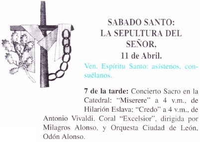 Concierto Sacro en la Catedral; "Miserere" a 4 v.m. de Hilarión Eslava; "Credo" a 4 v.m. de Antonio Vivaldi. Coral "Excelsior", dirigida por Milagros Alonso, y Orquesta Ciudad de León, Odón Alonso.