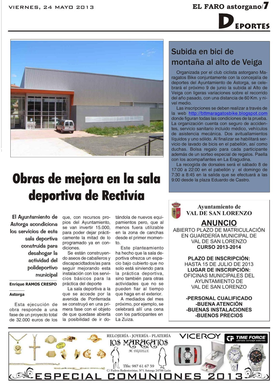 24.05.2013 El Faro. Obras de mejora en la sala deportiva de Rectivía. El Ayuntamiento de Astorga acondiciona los servicios de esta sala deportiva construida para desahogar la actividad del polideportivo municipal.