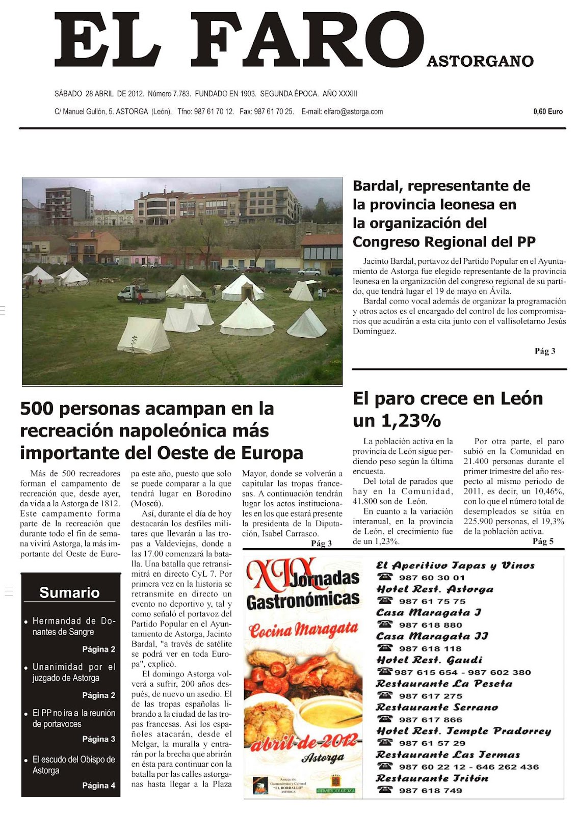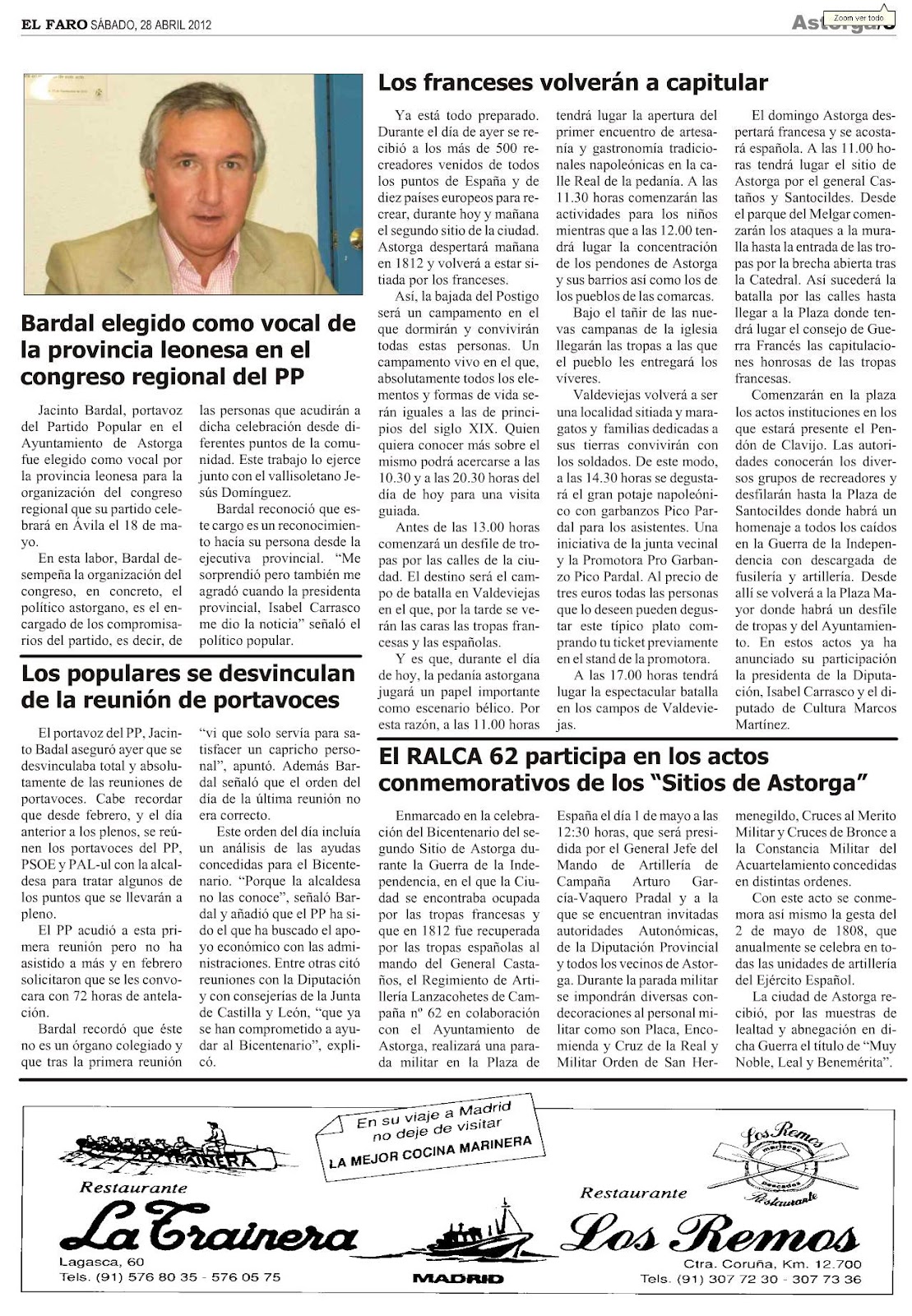 28.07.2011 El Faro Astorgano. El PP quiere recordar en 2012 el bicentenario de la liberación de Astorga y del primer ayuntamiento constitucional. Coste estimado de más de 200.000 euros.