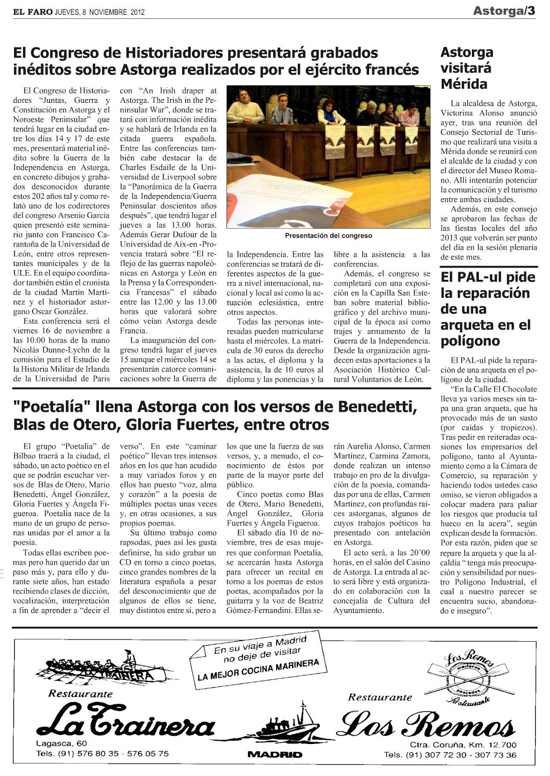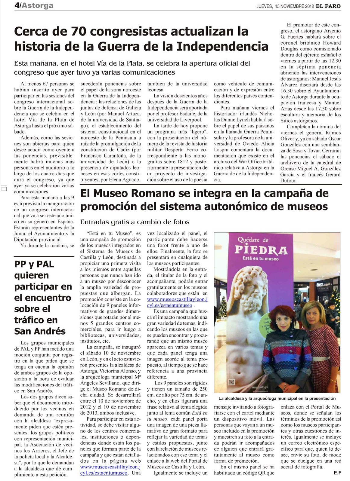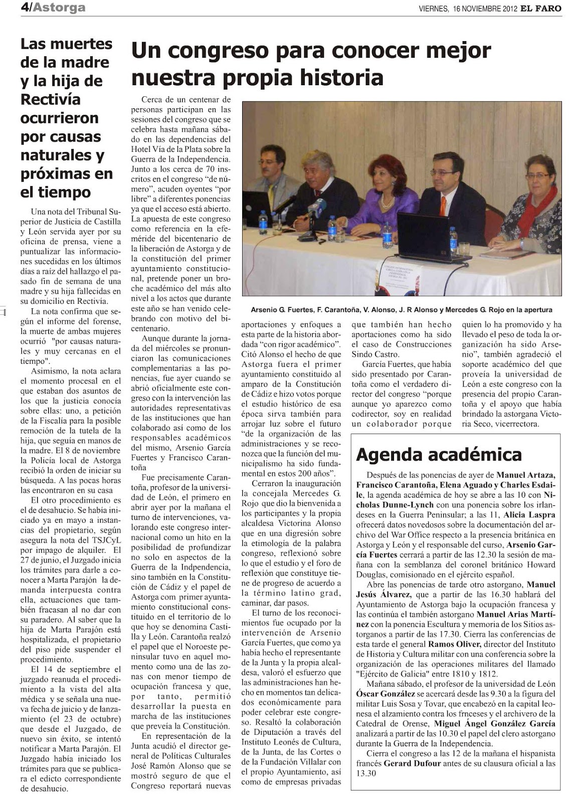 15.11.2012 El Faro Astorgano. Un congreso para estudiar la guerra de la Independencia en Astorga. Ayer arrancaron las comunicaciones y hoy se celebrará la inauguración.