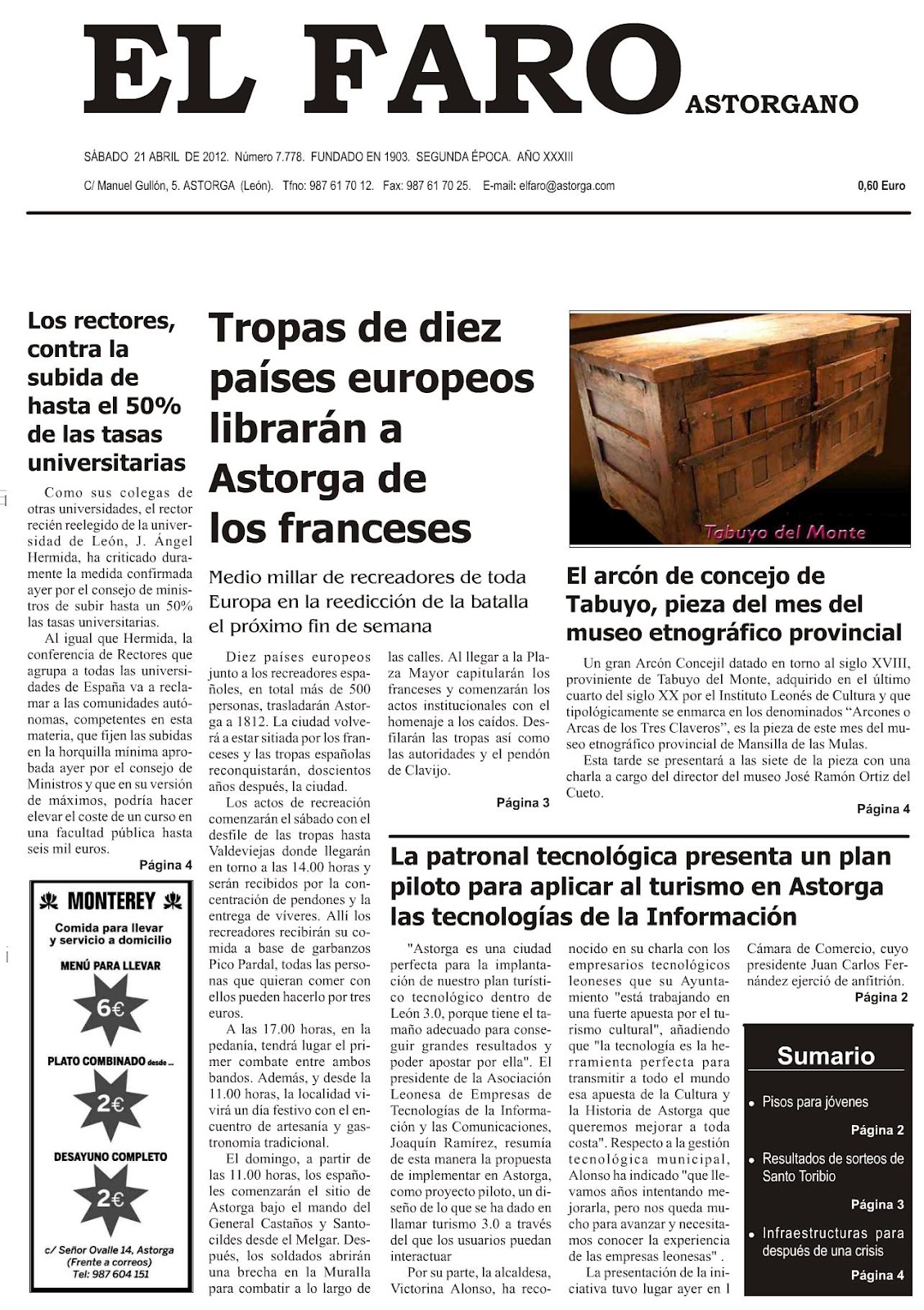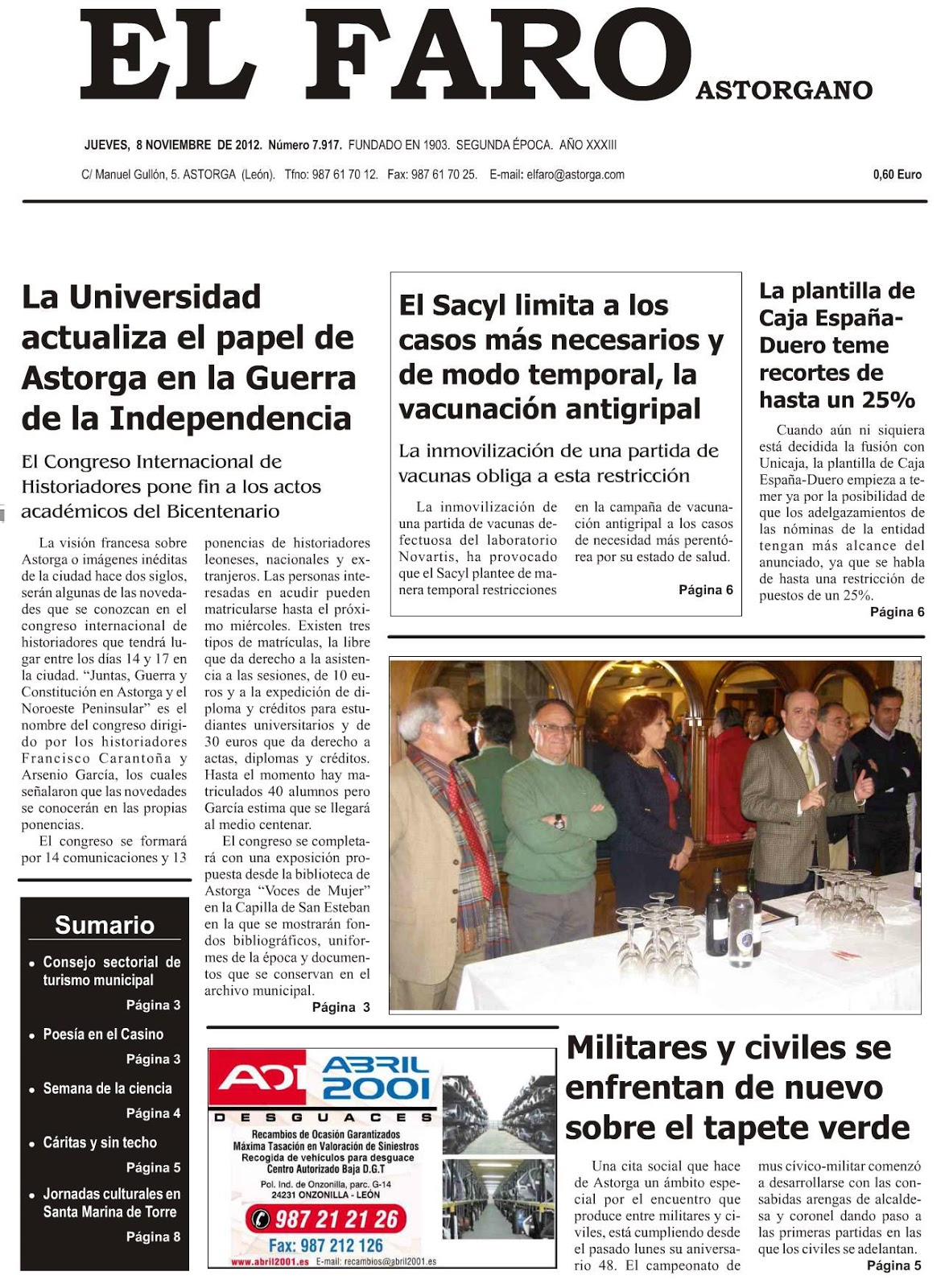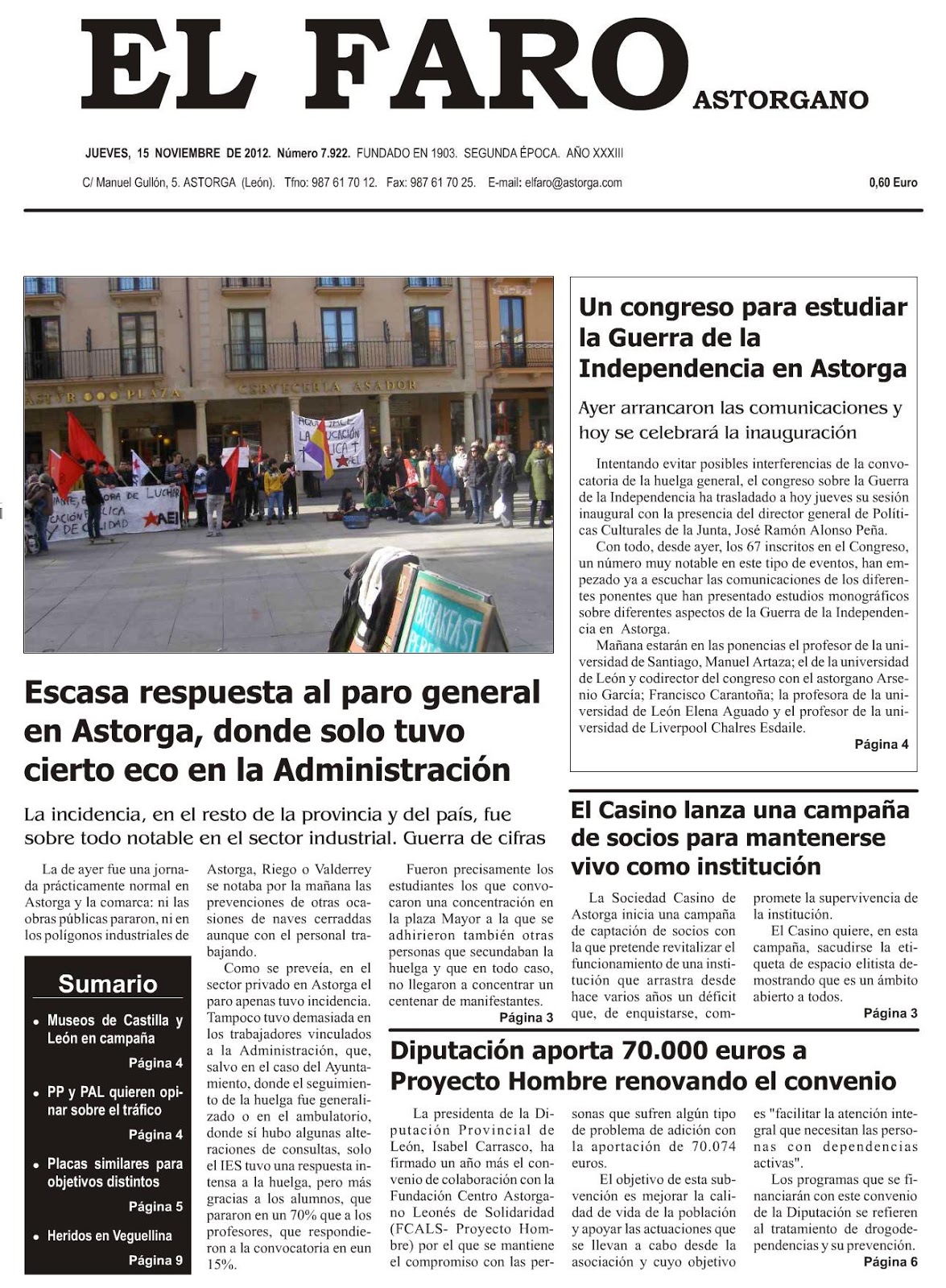 15.11.2012 El Faro Astorgano. Un congreso para estudiar la guerra de la Independencia en Astorga. Ayer arrancaron las comunicaciones y hoy se celebrará la inauguración.