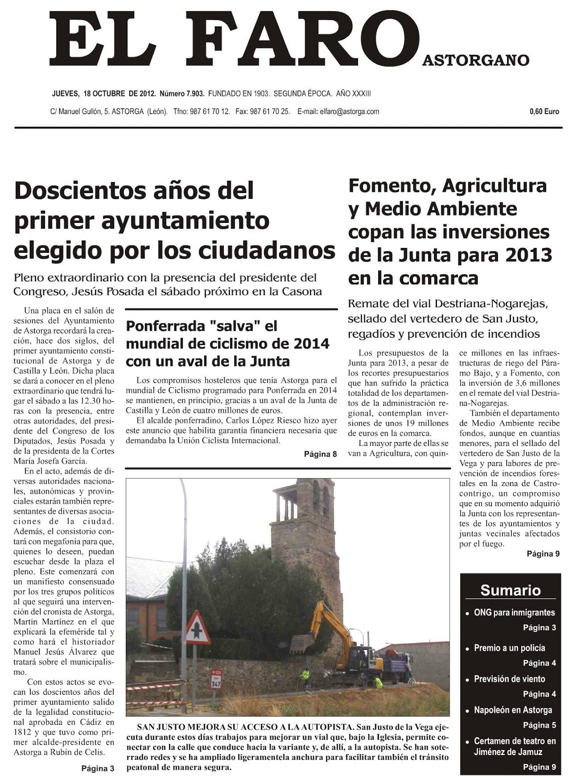 18.10.2012 El Faro Astorgano. Doscientos años del primer ayuntamiento elegido por los ciudadanos. Pleno extraordinario con la presencia del presidente del Congreso, Jesús Posada el sábado próximo en la Casona.