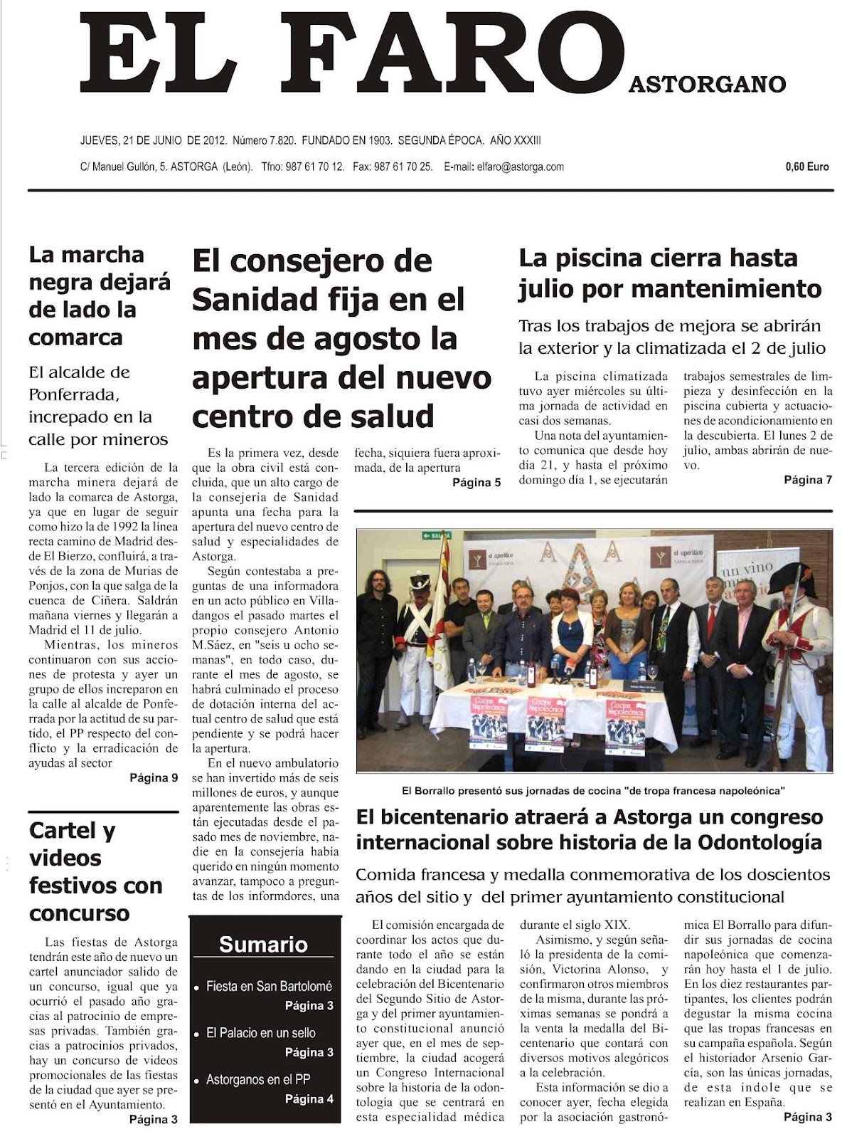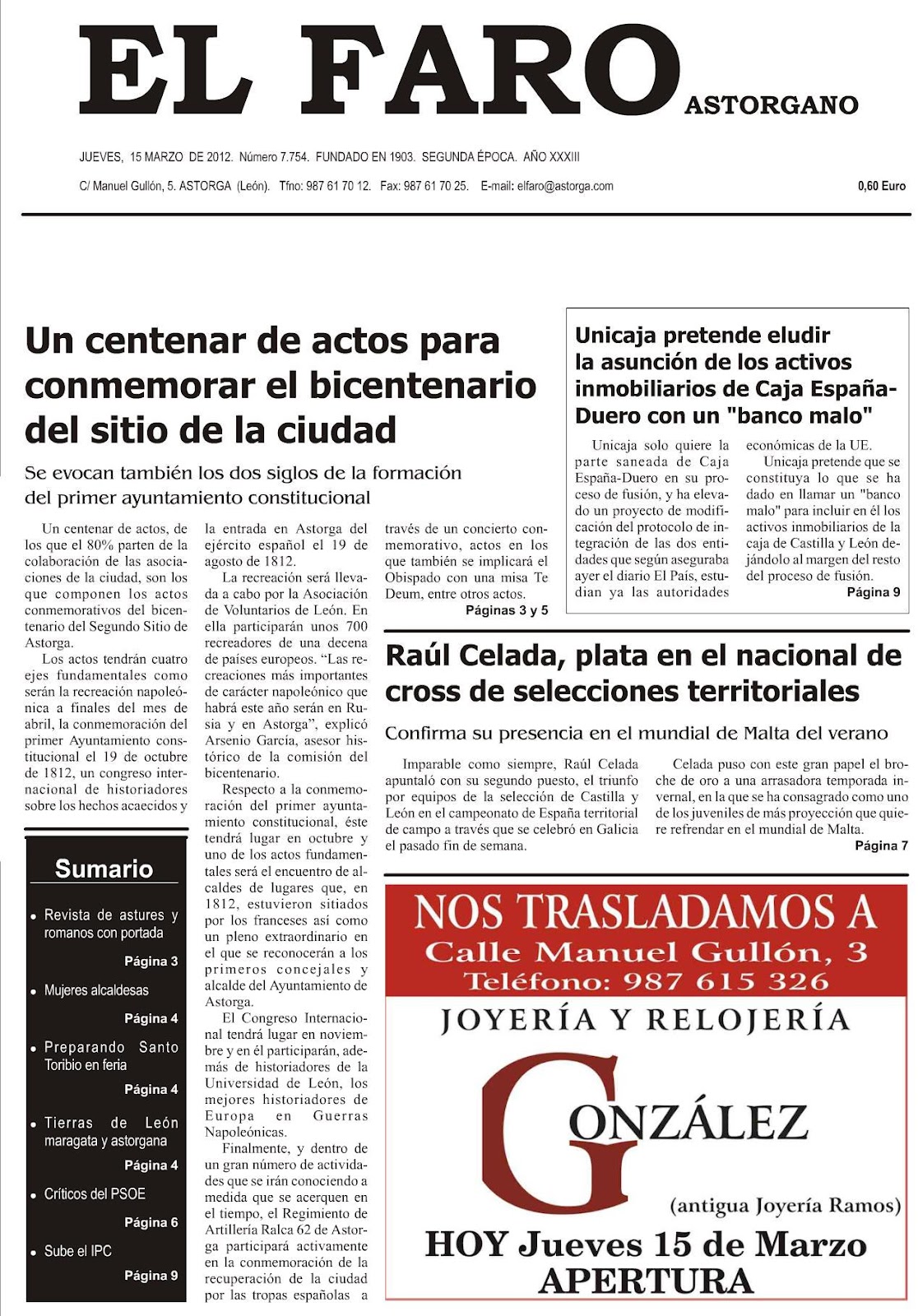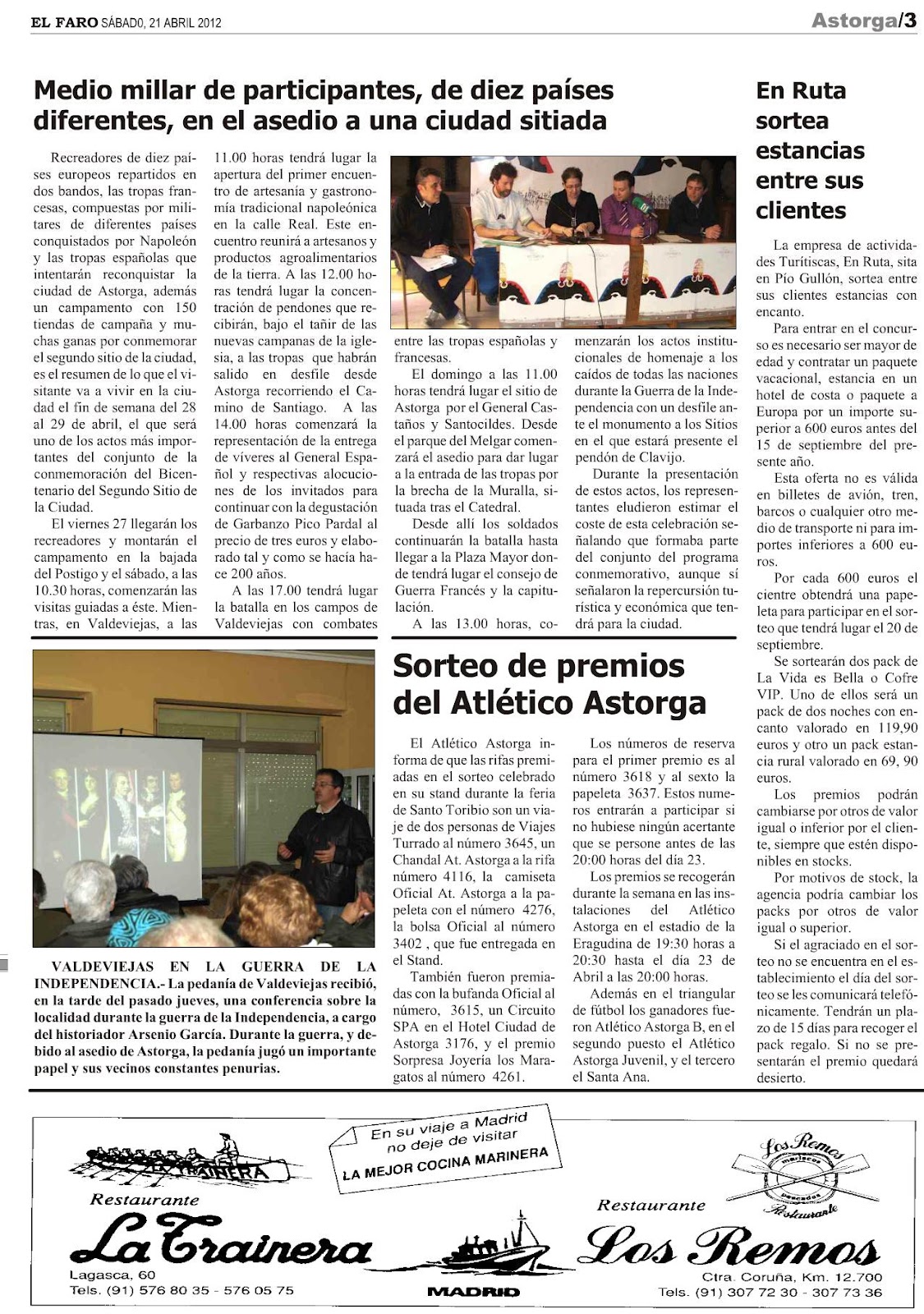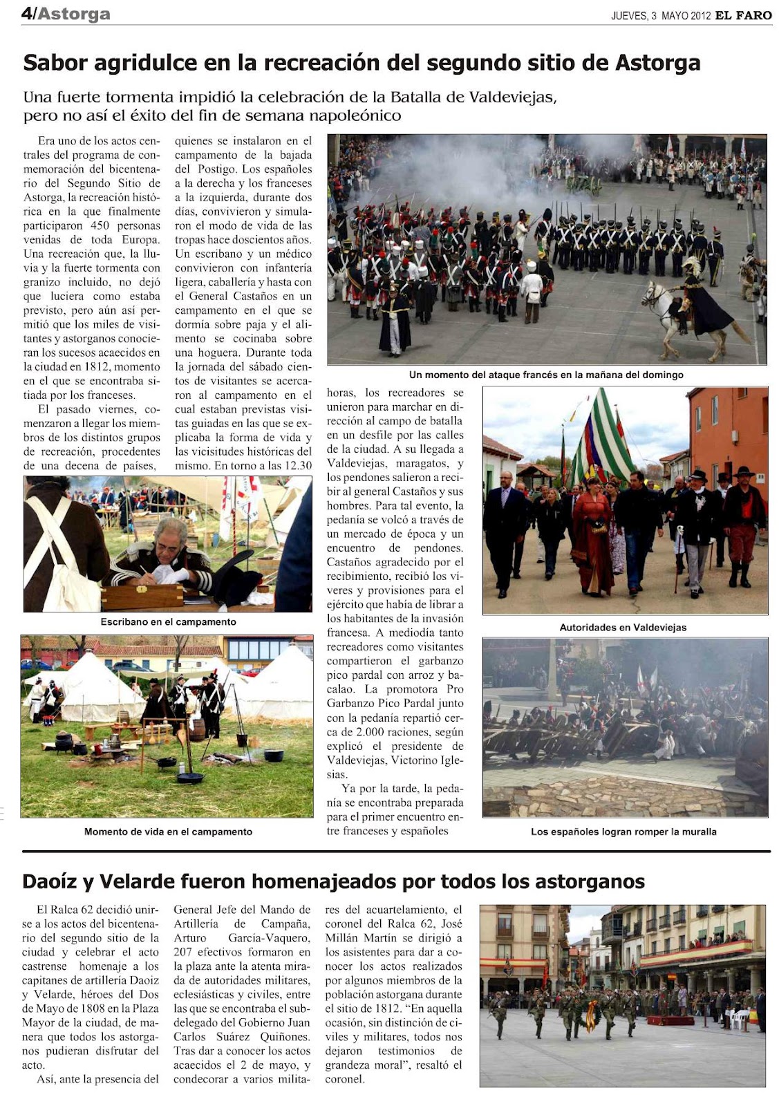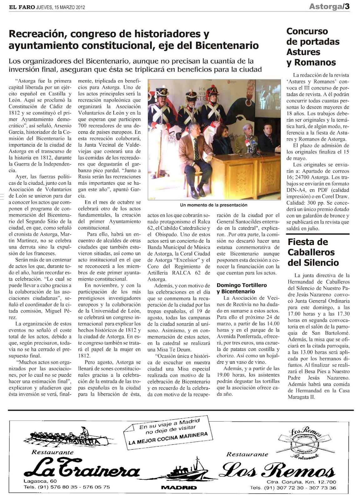 15.03.2012 El Faro Astorgano. Un centenar de actos para conmemorar el bicentenario del sitio de la ciudad. Se evocan también los dos siglos de la formación del primer ayuntamiento constitucional.