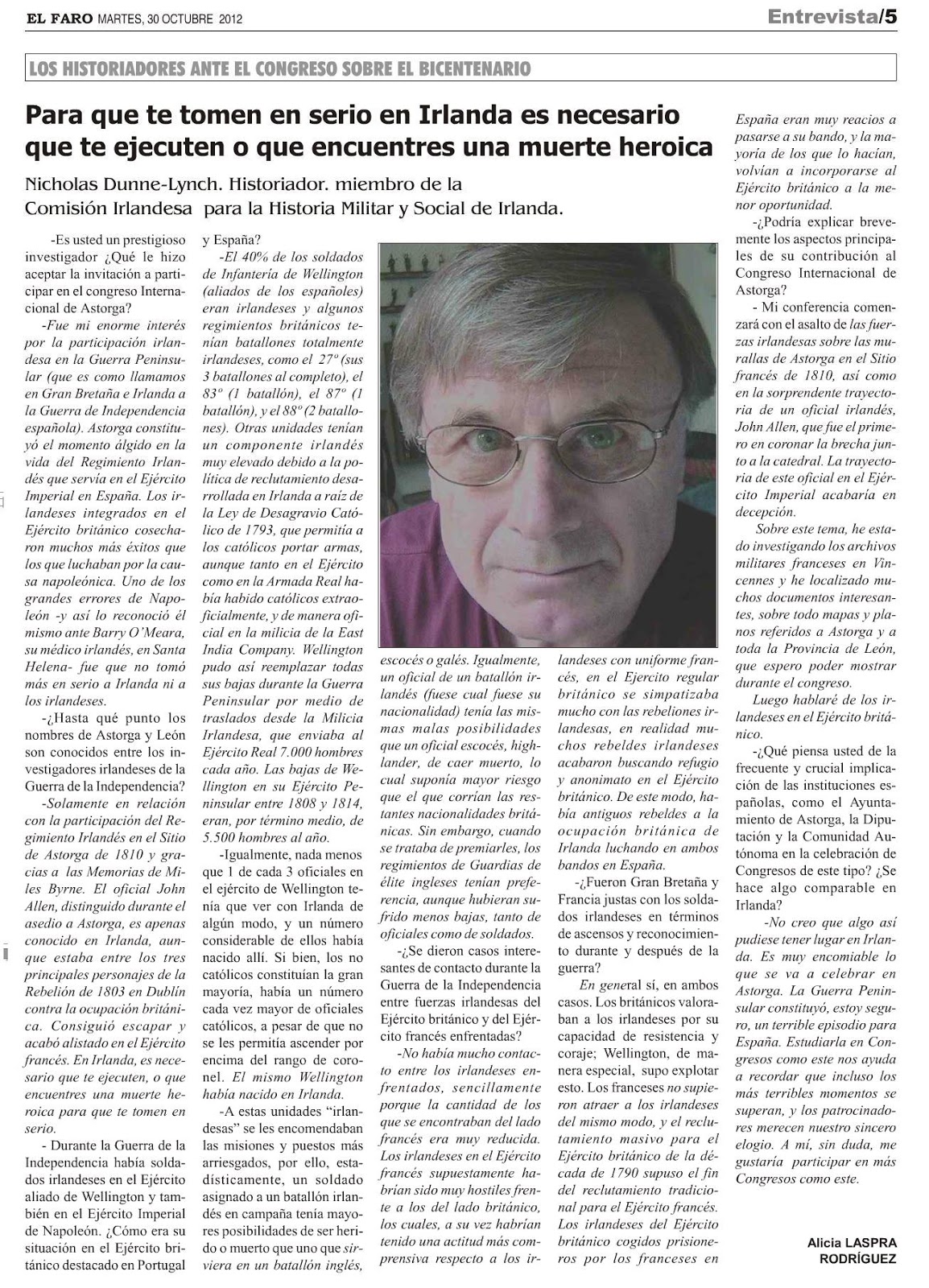 Historiadores ante el congreso sobre el bicentenario. Alicia Laspra Rodríguez. Para que te tomen en serio en Irlanda es necesario que te ejecuten o que encuentres una muerte heroica. Nicholas Dunne-Lynch, Historiador, miembro de la Comisión Irlandesa para la Historia Militar y Social de Irlanda.