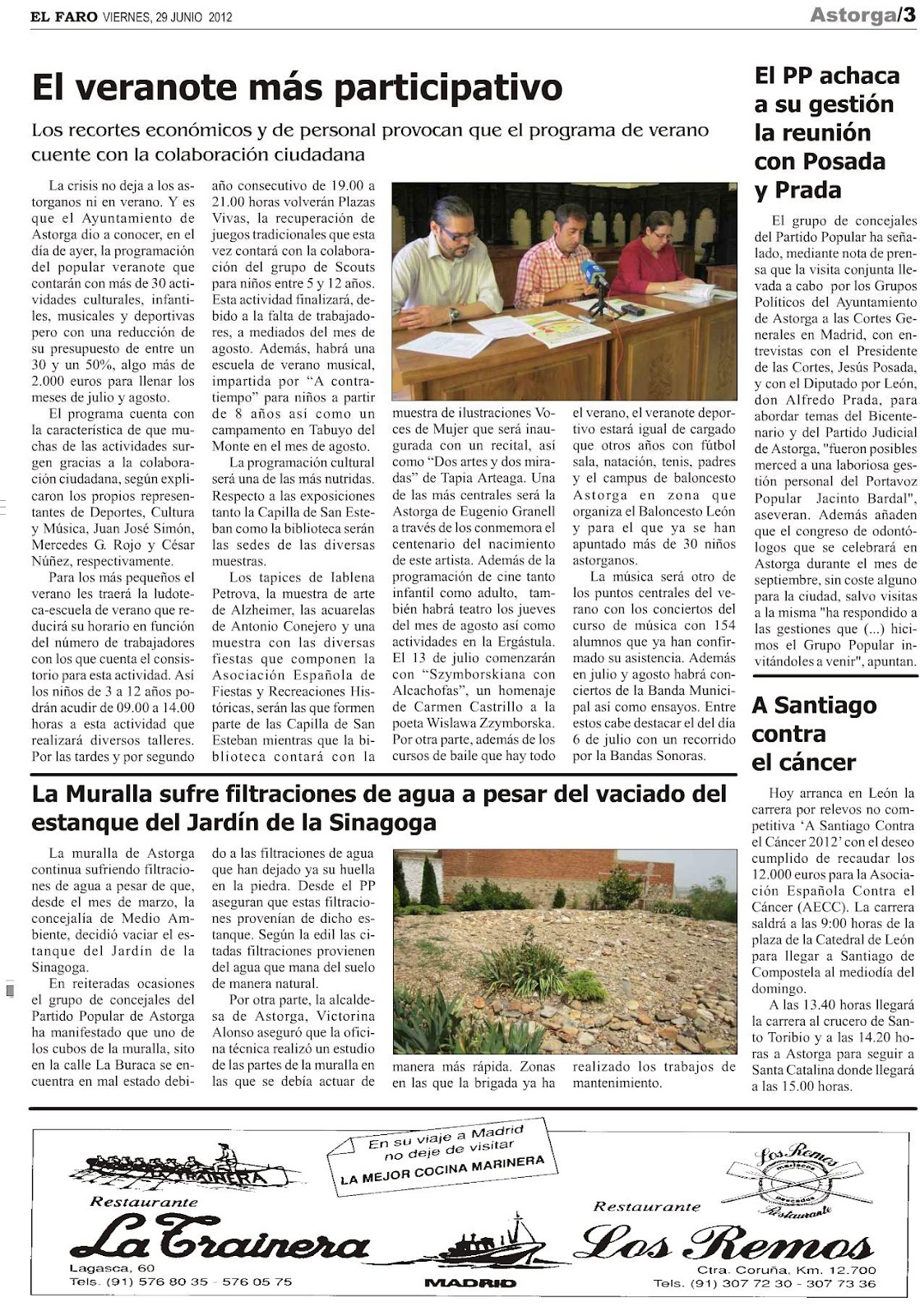 29.06.2012 El Faro. El PP achaca a su gestión la reunión con Posada y Prada que “fueron posibles merced a una laboriosa gestión personal del Portavoz Popular Jacinto Bardal”; el Congreso de Odontólogos que se celebrará en Astorga durante el mes de septiembre, sin coste alguno para la ciudad, salvo visitas “a respondido a las gestiones que (…) hicimos el Grupo Popular invitándoles a venir”, apuntan .