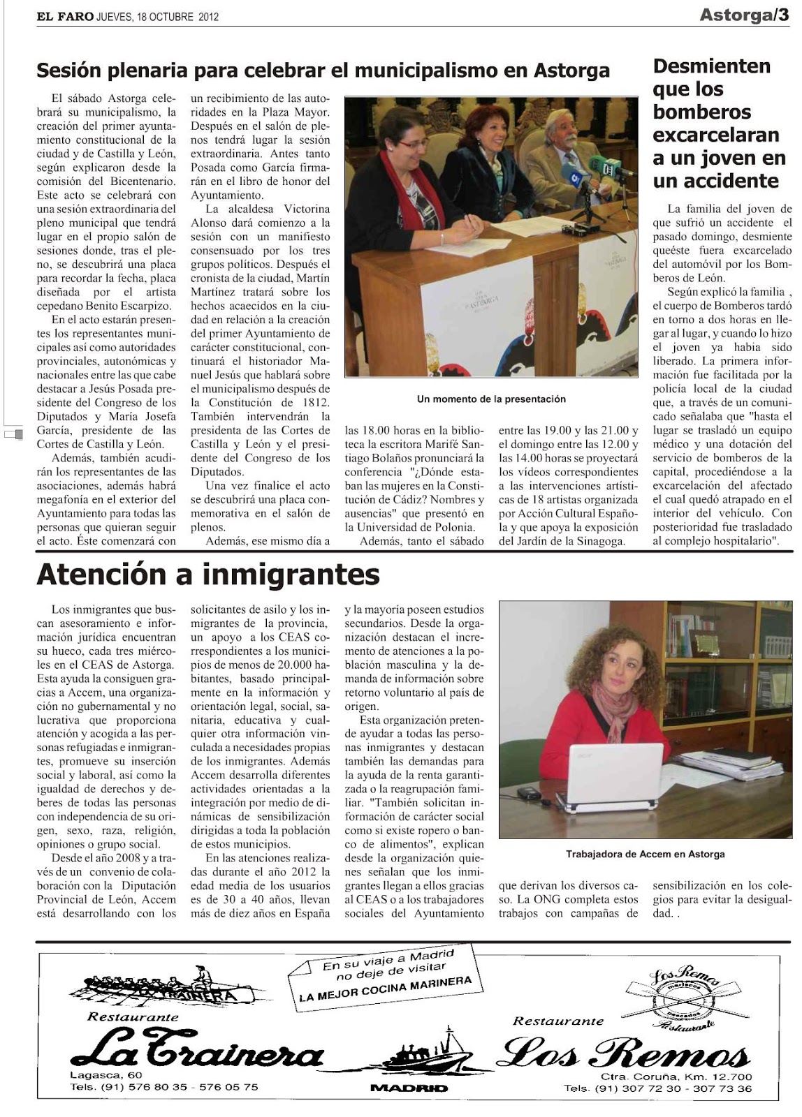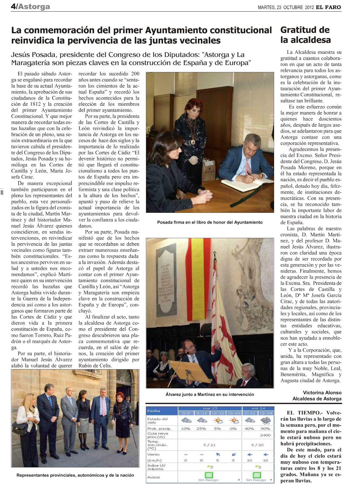 21.10.2012 Diario de León. Astorga, cuna de la democracia. Bicentenario de la adhesión a la Constitución. Posada alaba el «sufrimiento» maragato para el triunfo de la democracia española. El presidente del Congreso destaca el papel de los ayuntamientos por su cercanía a los ciudadanos.