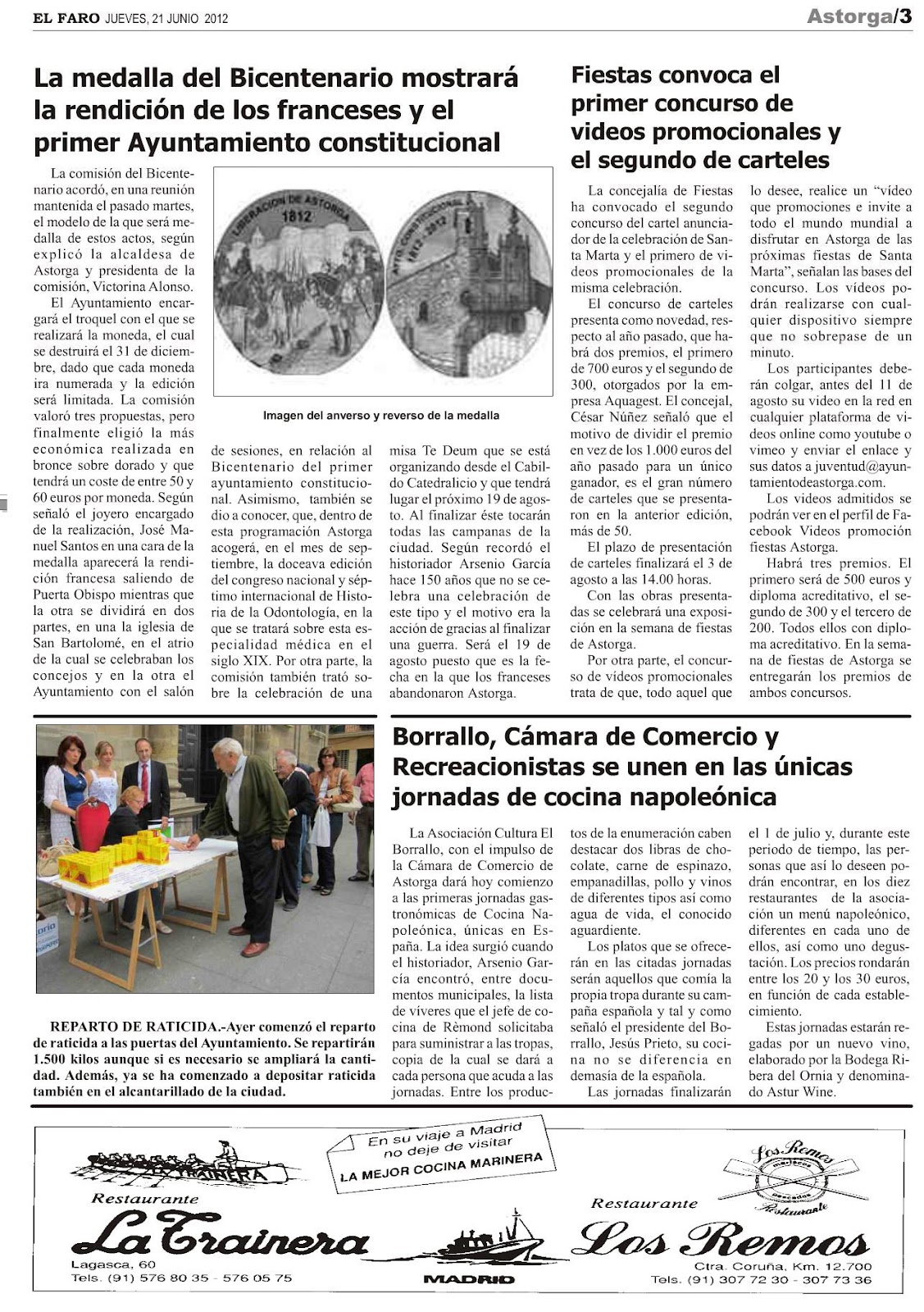 21.06.2012 El Faro Astorgano. Comida francesa y medalla conmemorativa de los doscientos años del sitio y del primer ayuntamiento constitucional.