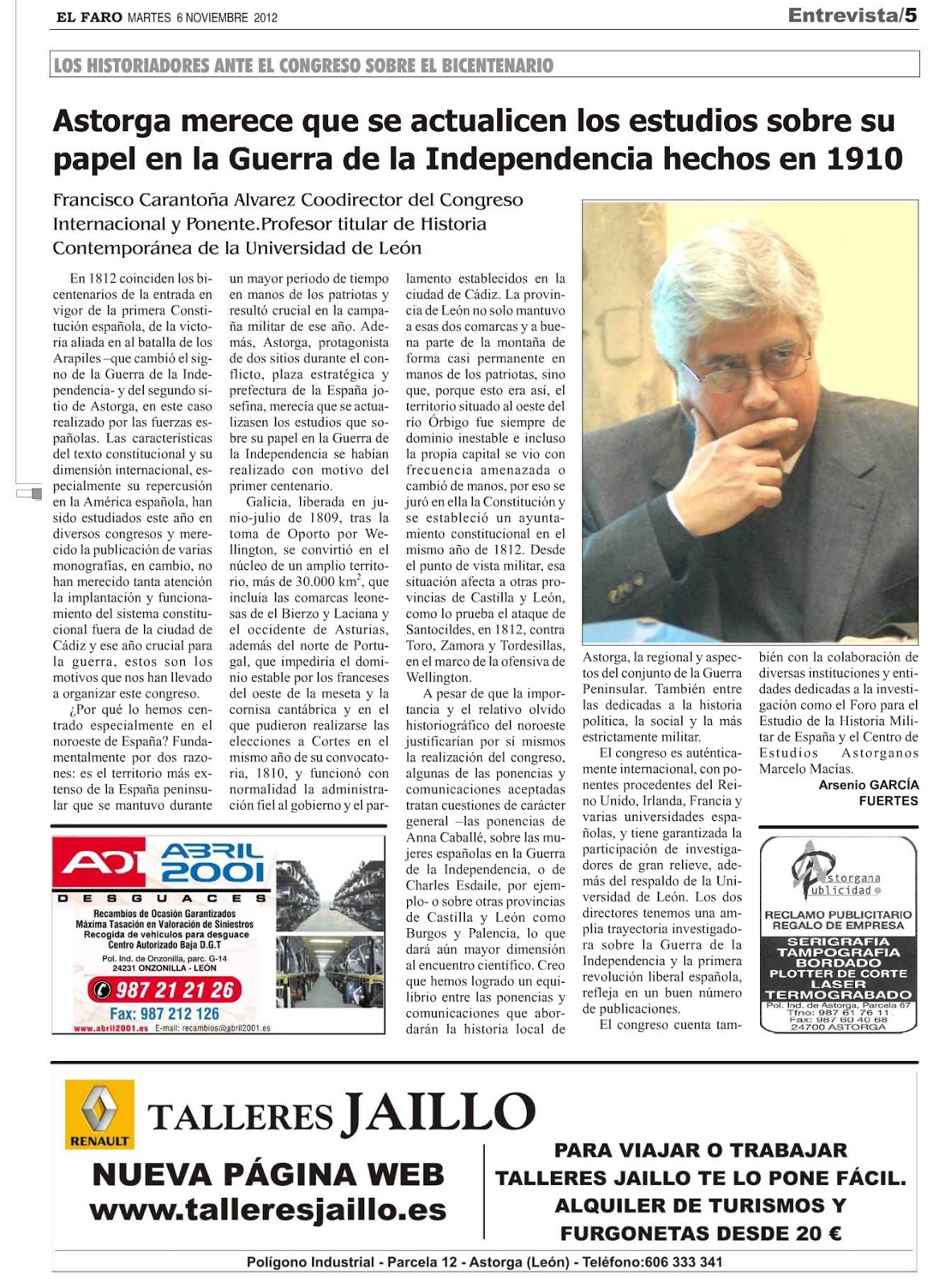 6.11.2012 El Faro Astorgano. Historiadores ante el congreso sobre el bicentenario. Arsenio G. Fuertes.